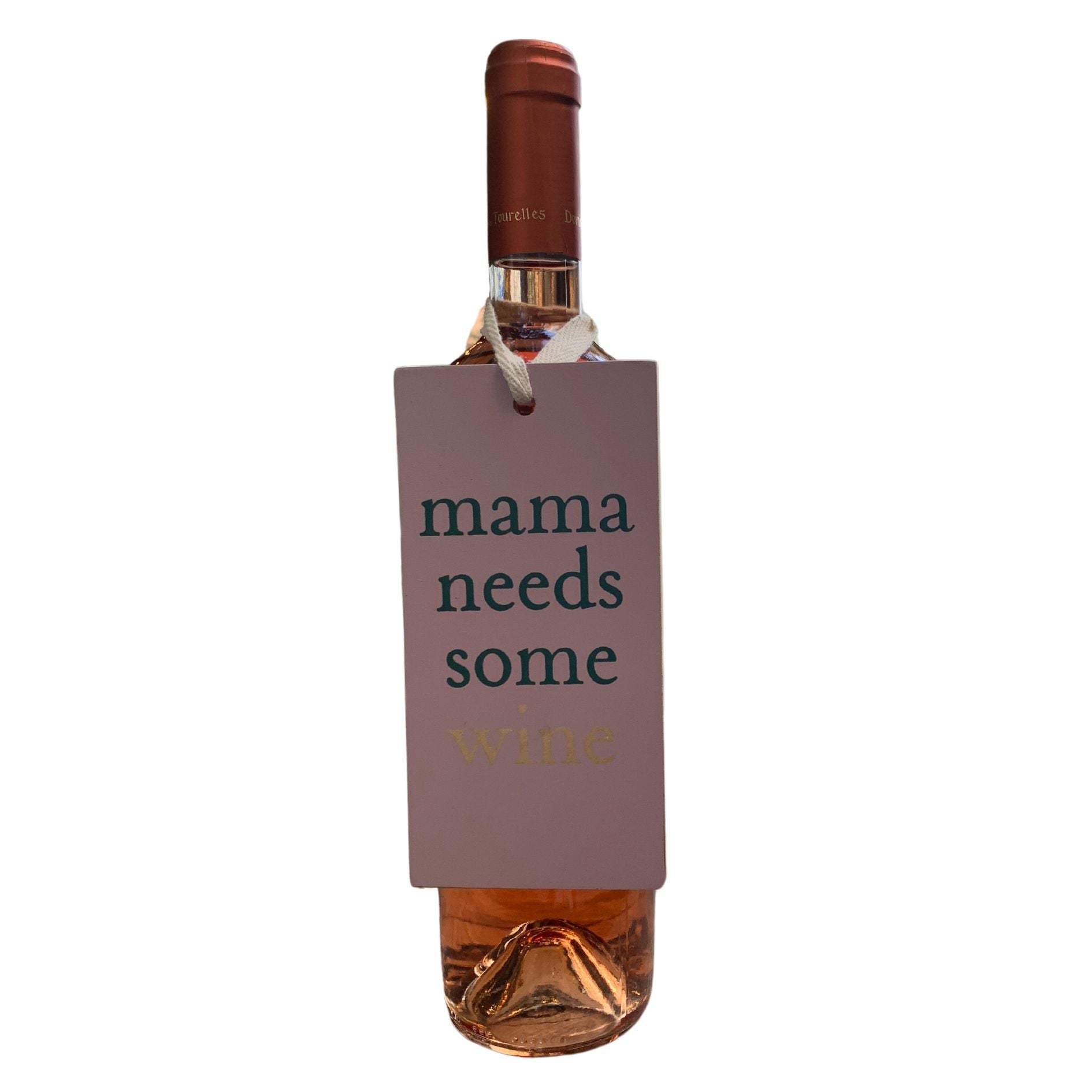 A wooden bottle tag featuring a hand lettered "Mama Needs Some Wine" sentiment in a blush, emerald, and metallic palette. Contains top fabric loop for attaching to a bottle of wine.