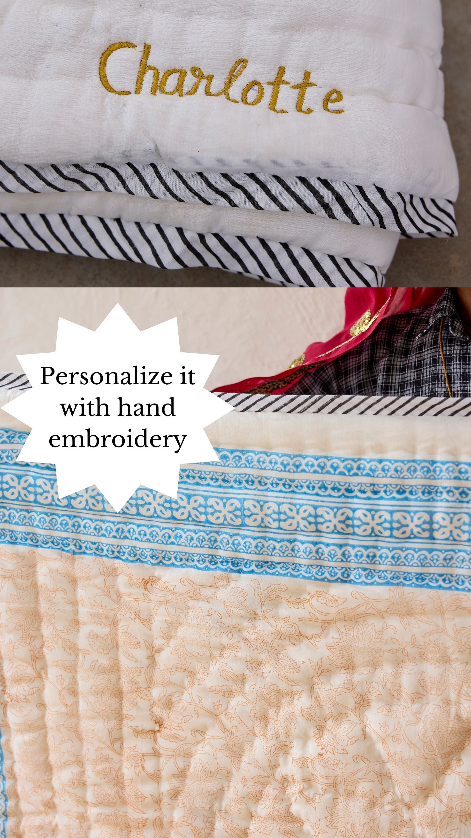 Enhance this beautiful quilt with our customizable hand-embroidery option, allowing you to embroider your baby's name or a heartfelt message, making it a truly personal and cherished item.