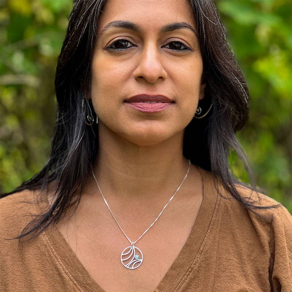 This exquisite necklace is handmade by talented silversmiths in Bali. It features a sterling silver spiral pendant with a tiny blue topaz stone.  The silver has a soft, brushed finish which creates a beautiful patina. Pendant measures approximately 1"  in diameter (not including bale). .925 sterling silver; Blue topaz 18" Sterling silver chain.