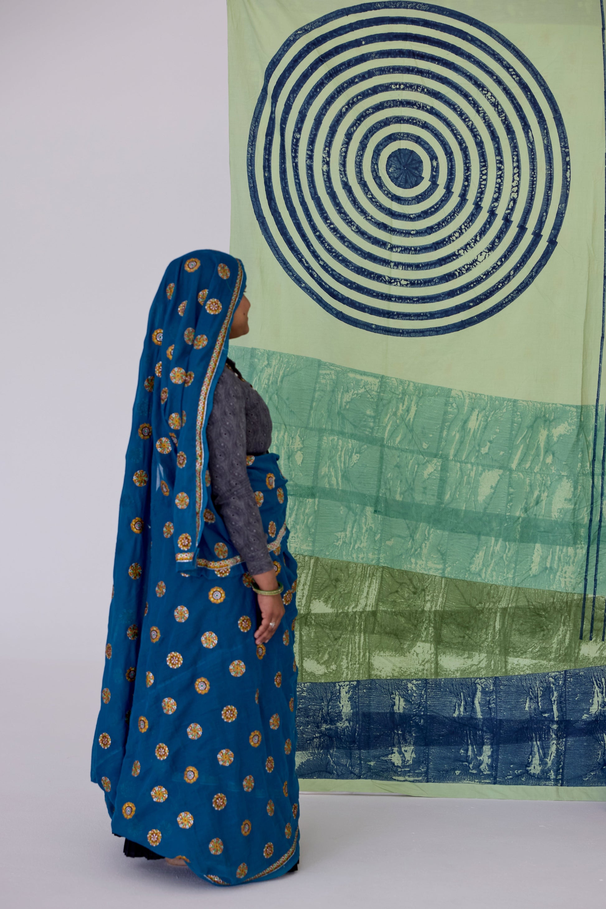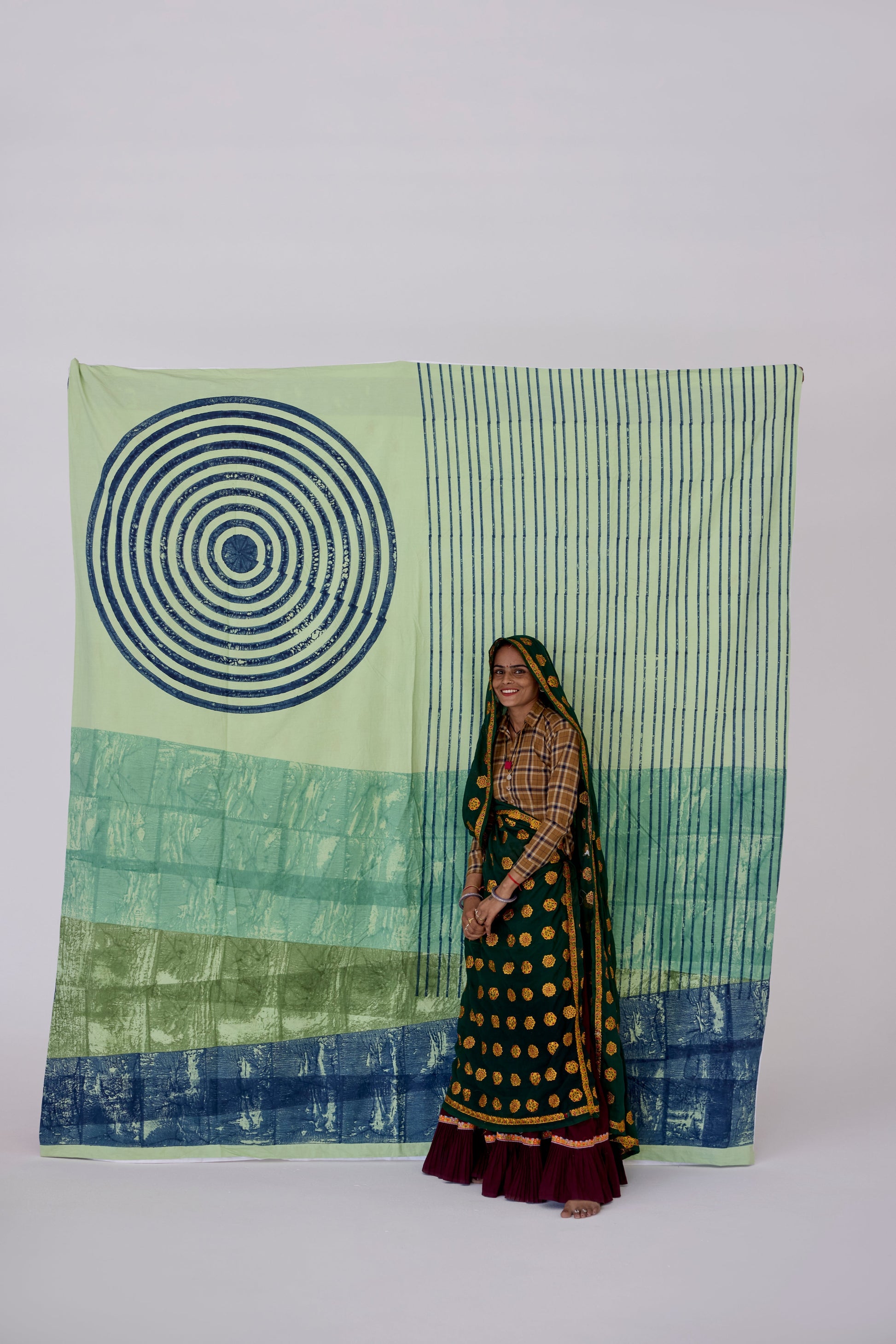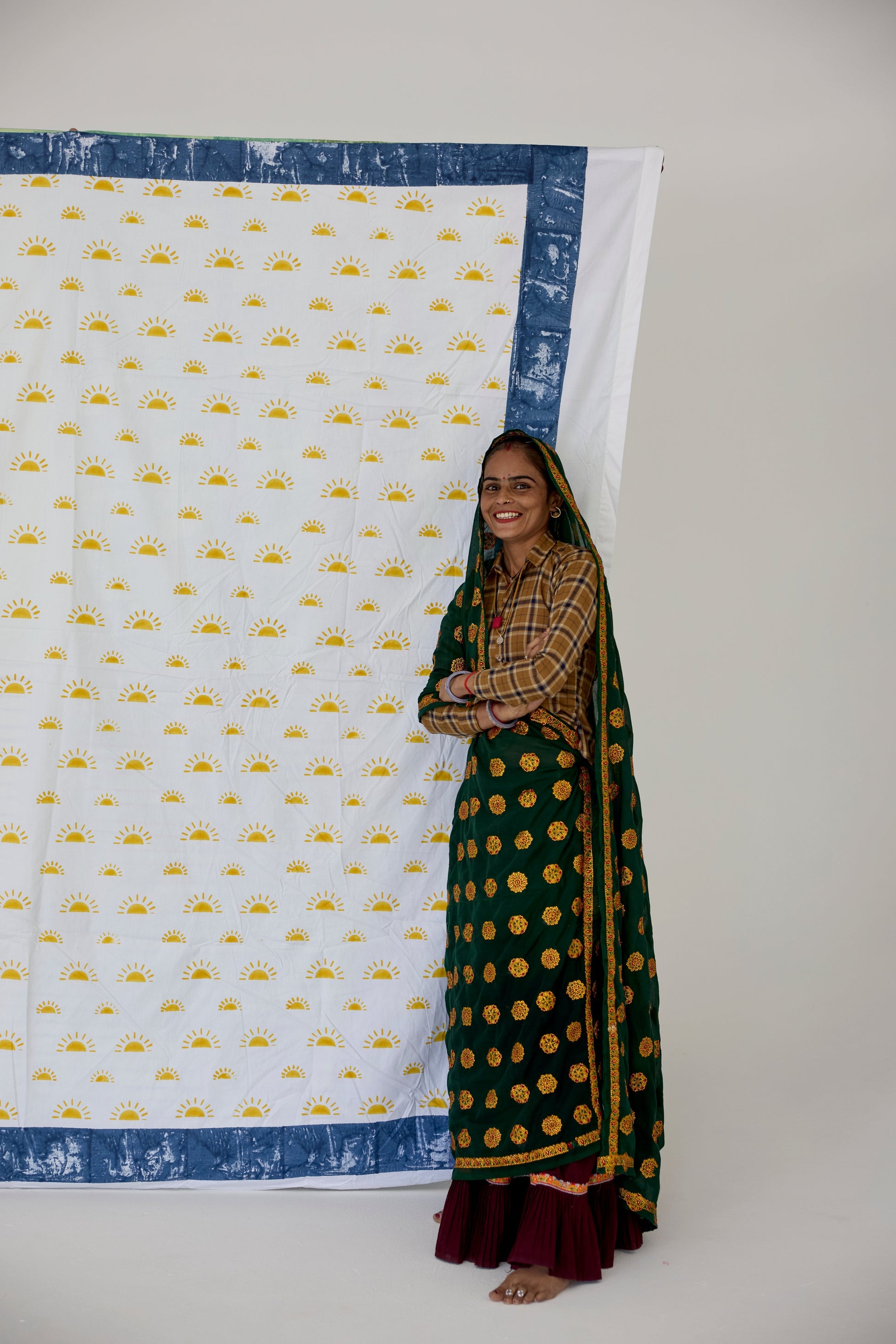 Our stunning Ojai reversible duvet cover is hand-block printed and crafted from 100% cotton. One side showcases a striking geometric design in calming shades of green and blue. The reverse side features a playful yet elegant sun motif in warm yellow against a crisp white background, framed by a deep indigo border.