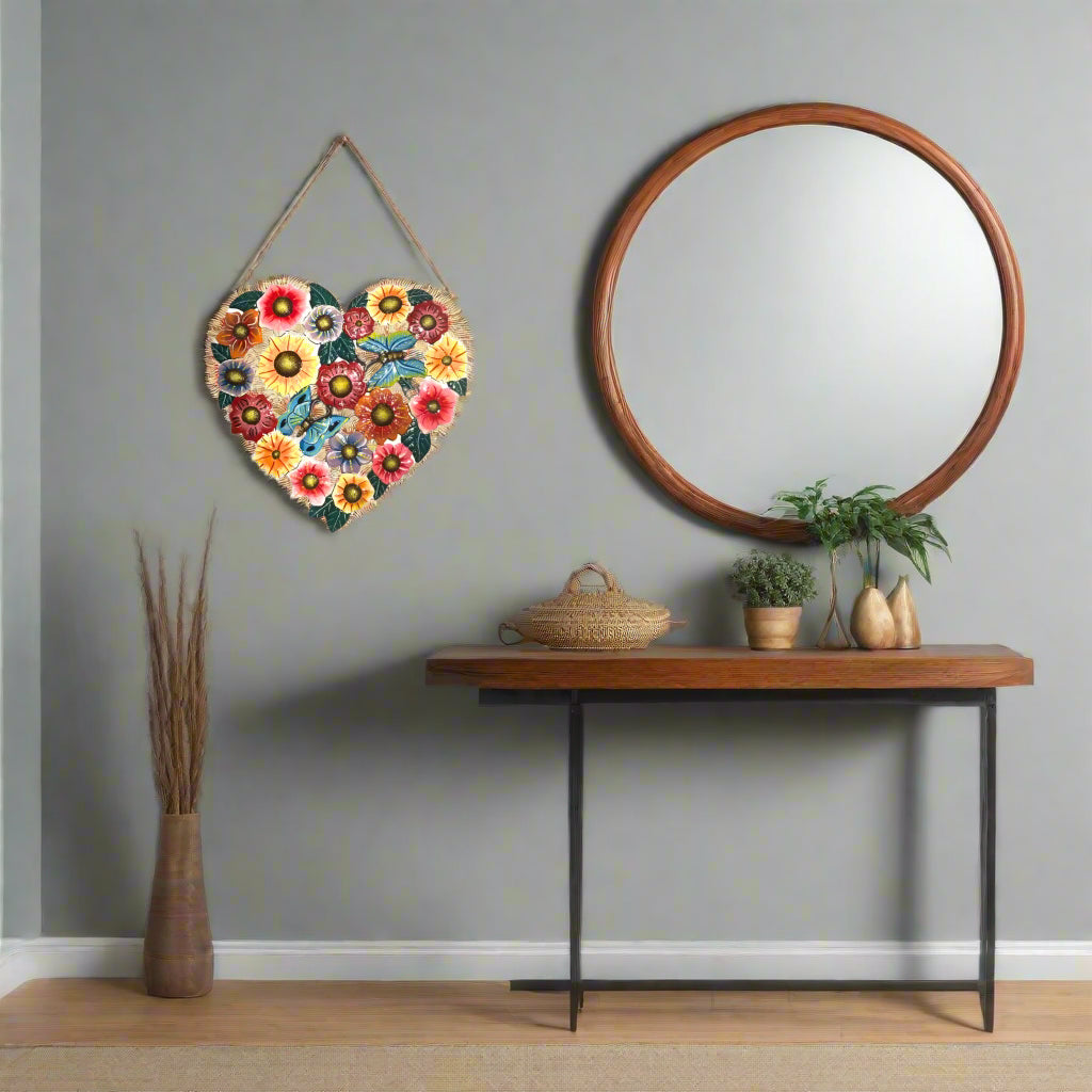 Painted My Heart Is Full is a‚ one-of-a-kind Haitian metal art masterpiece made for indoor and outdoor decorative use. A gorgeously‚ detailed and vibrantly painted floral love-themed piece, Painted My Heart Is Full‚ will make a statement in any home, patio, or garden area.