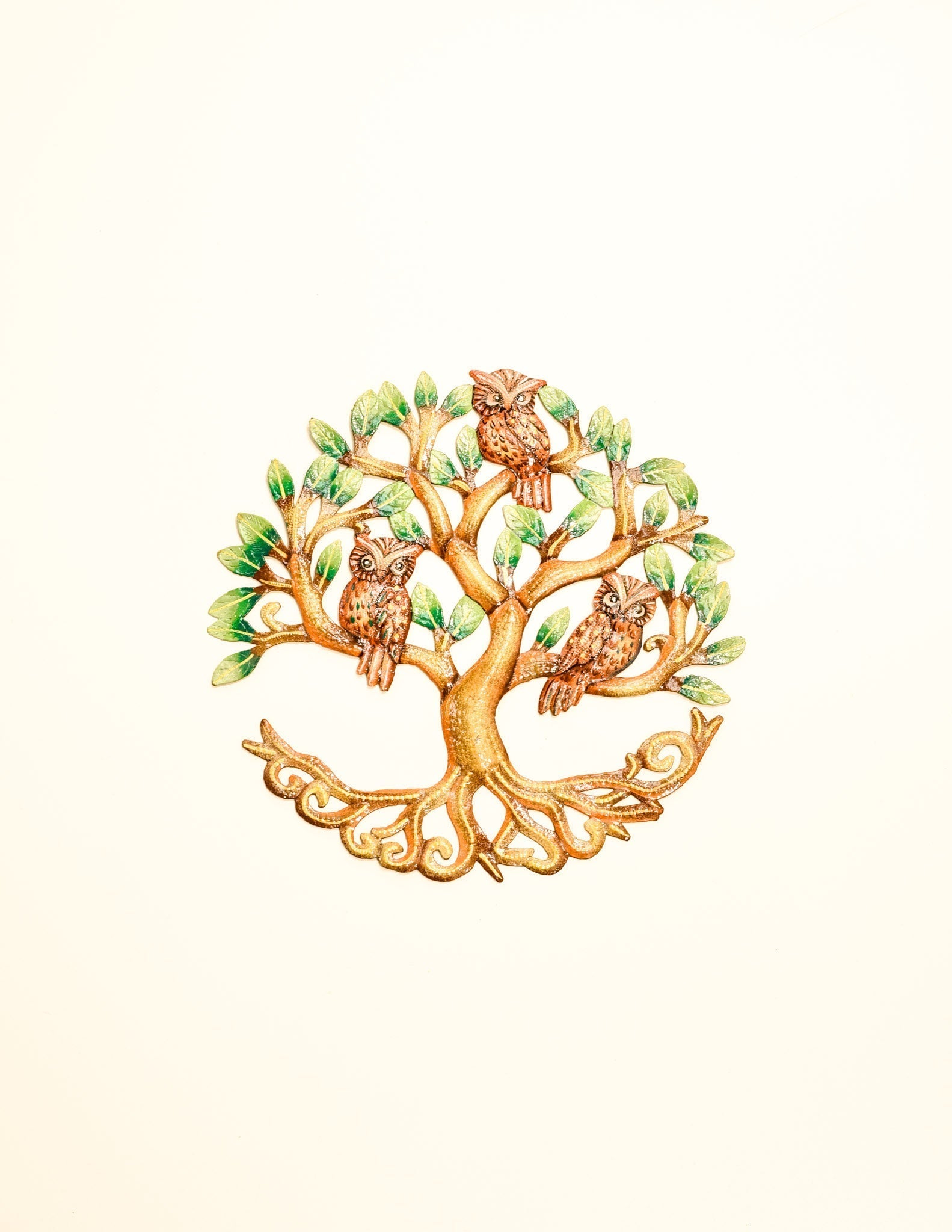 A 2022/2023 new arrival to the Beyond Borders Haitian metal art line. Painted Three of a Kind is a painted round metal art piece made for both indoor and outdoor decorative use. With beautifully detailed owls, colorful leaves, and‚ winding tree roots, Painted Three of a Kind will make a visual statement‚ in any home, patio, or garden area.