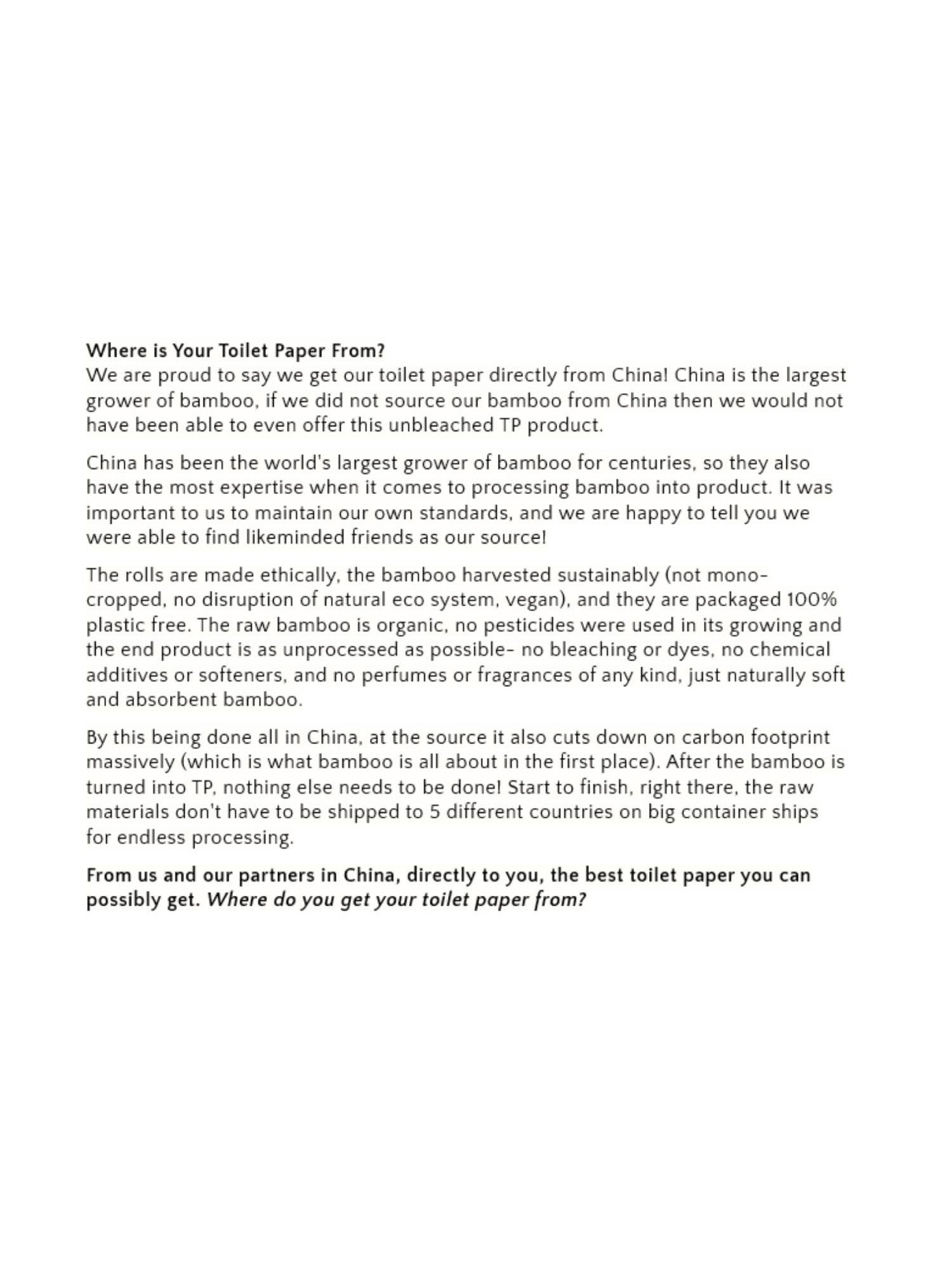 Soft | Unlike other bamboo or "eco" type toilet paper our toilet paper is extra thick and has a very soft feel, you only need a few sheets! Extra soft and fluffy, 3-ply Bamboo Toilet Paper. Made from 100% renewable organic bamboo = no harsh chemicals.