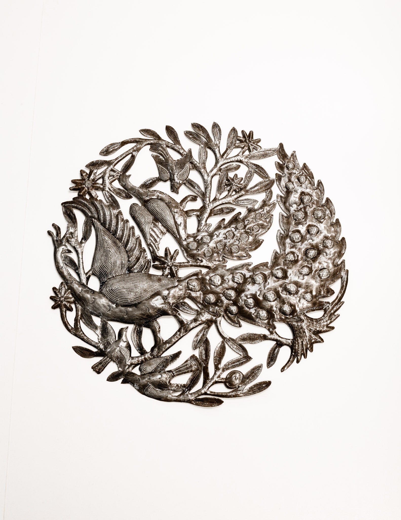 A 2022/2023 new arrival to the Beyond Borders Haitian metal art line, Peacock in Garden is an unpainted round metal art piece made for both indoor and outdoor decorative use. The perfect decorative metal art piece for your home, garden, or farmhouse.