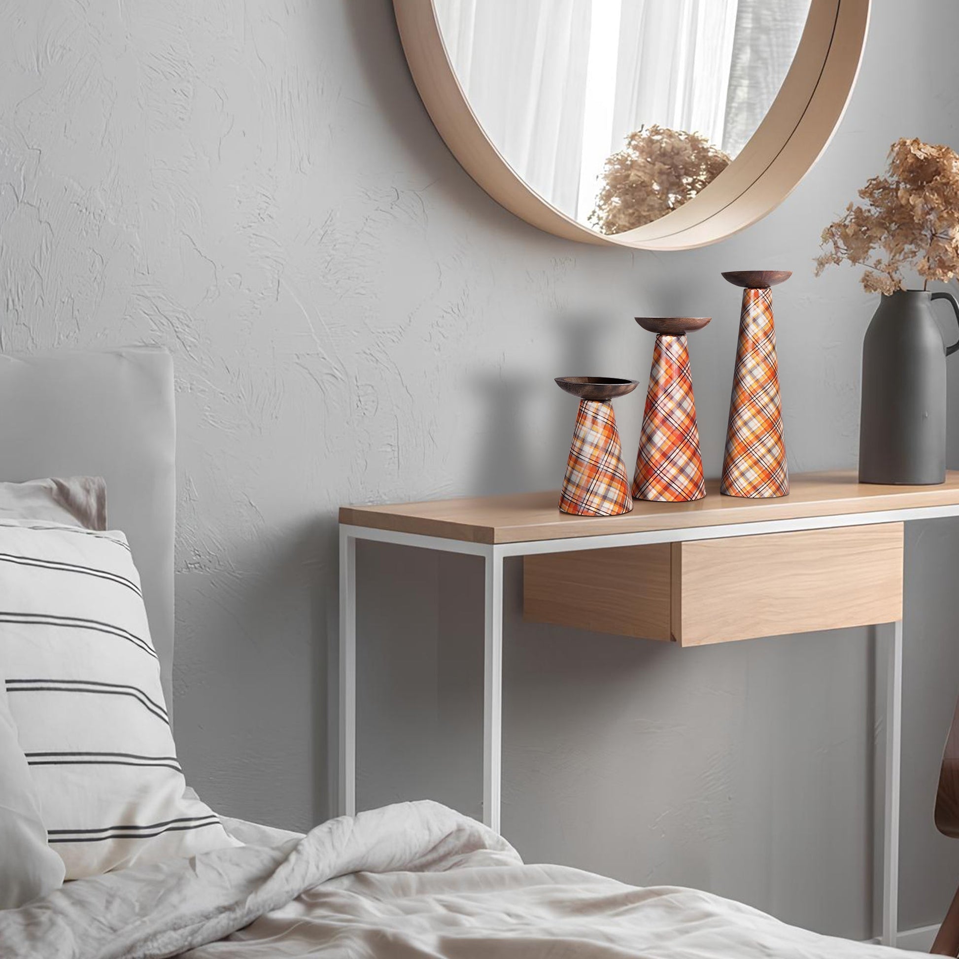Illuminate your home with our Plaid Enamelled Candleholder Set. The combination of warm colours and wooden elements makes these candle holders a charming addition to seasonal or farmhouse-style décor.
