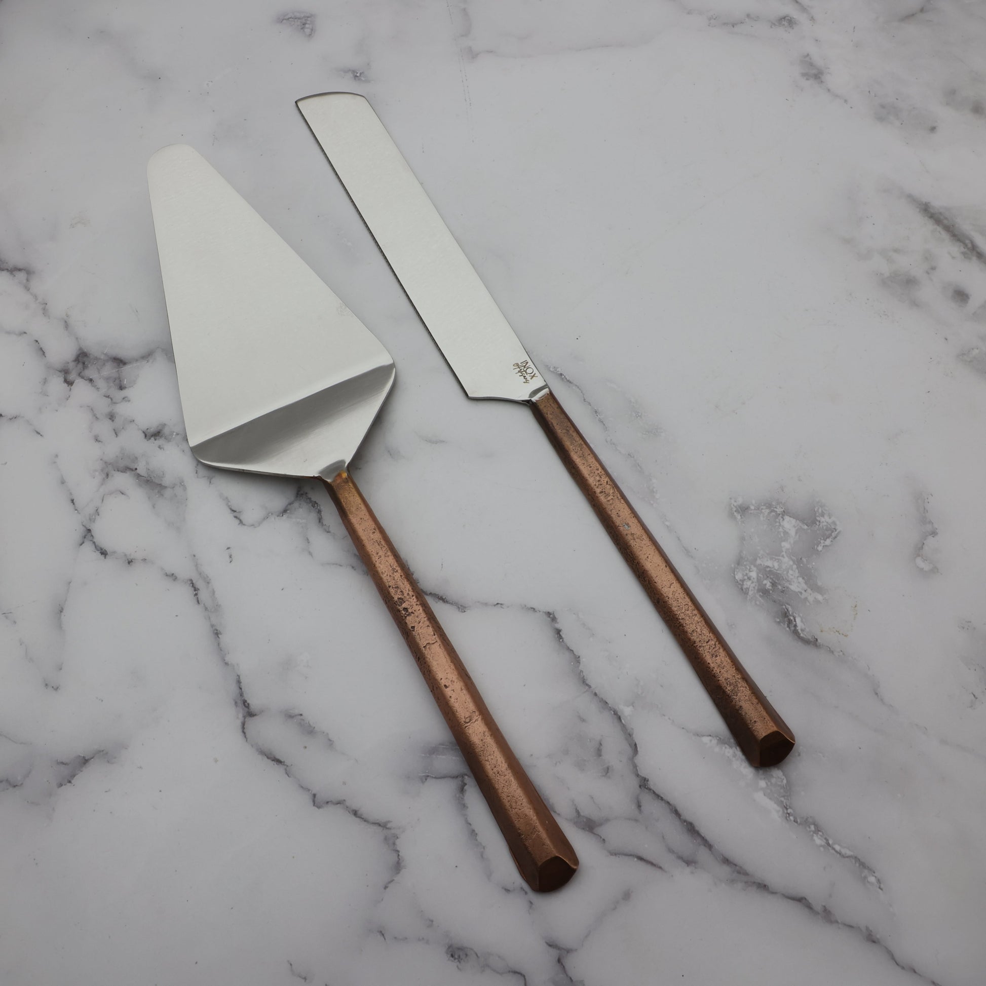 The Plateau Cake and Pie Server Set will add charm to your dessert table. Handcrafted for cutting and serving cakes and pies, the design features square beveled edge handles with a highly polished knife and server.