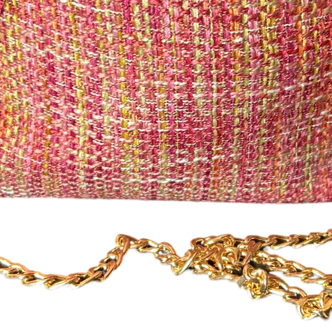 Vintage Gucci 100% silk scarf front paired coordinating tweed reverse. Fully lined with zipper closure and removable 23" drop gold-tone crossbody chain.