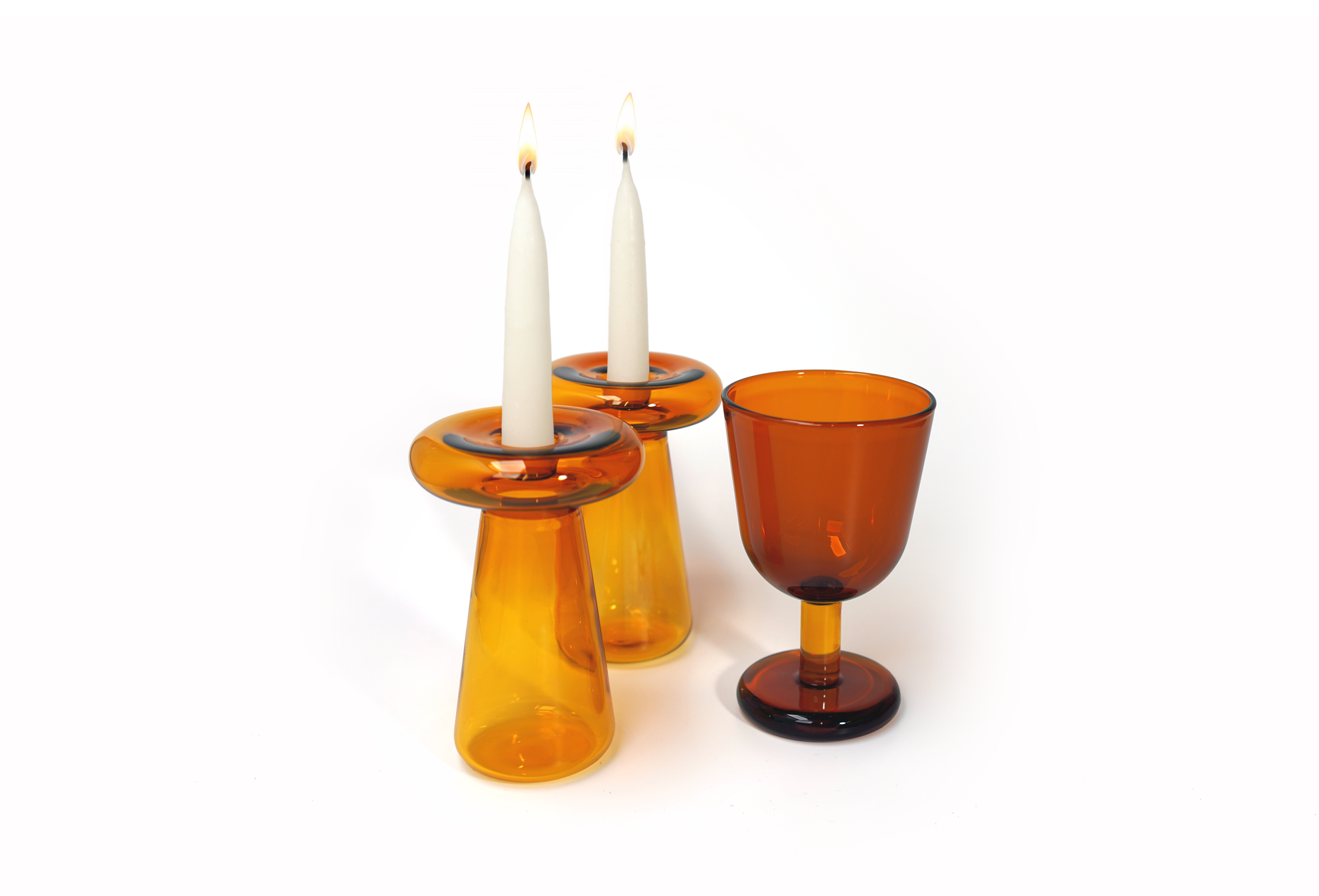 This Shabbat Set pairs two Mushroom Candlesticks with a matching Buttercup Glass. Each piece is made from durable mouth-blown borosilicate glass in complementary two-tone colorways. The set brings together the essential elements of the Shabbat table—candles and Kiddush—in a coordinated design meant to be used week after week.