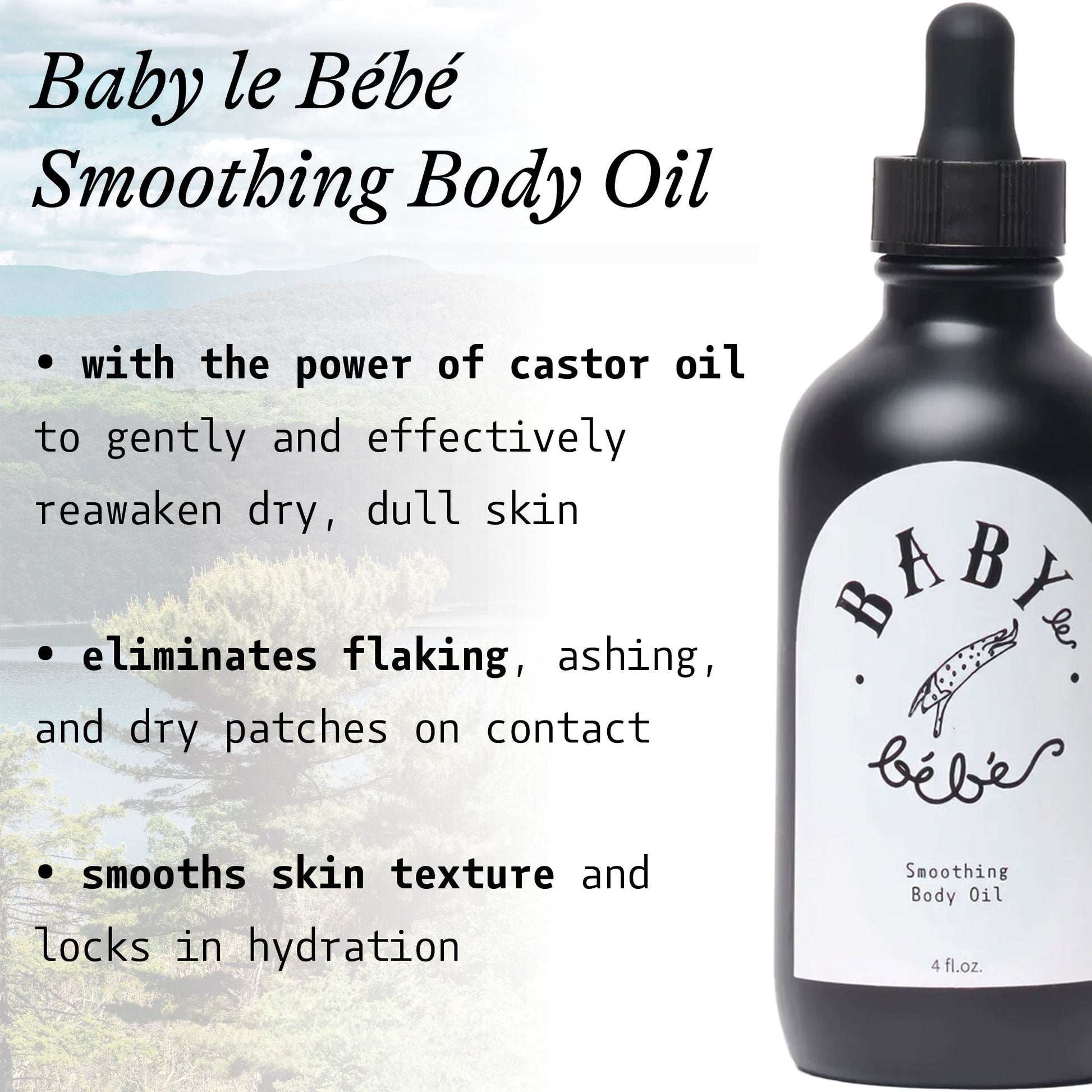 YUKA score: 100/100Forget everything you think you know about body oils, and get your best glow ever – naturally. Baby le Bébé Smoothing Body Oil effectively and luxuriously smooths, moisturizes, and softens even the driest and most damaged skin. This ultra-premium body oil is made with a 100% natural, 99% organic-origin blend of deeply renewing castor oil, antioxidant-rich rosehip oil, and ethereally light argan oil, supercharged with the skin-boosting power of clary sage, rosemary, bergamot, and basil. TO USE: Apply alone or as a finishing oil after moisturizers for a nourishing, and over time, refining hydration lock. Ingredients from 100% botanical origin. Always free from all synthetics, fillers, preservatives, and petroleum. Nutrient Summary: Vitamin A, vitamin C, vitamin E, vitamin K, polyphenols, flavonoids, tocopherols, oleic acid, linoleic acid, omega acids including 3, 6, and 9. Usage and Tips: •Apply right after showering to lock in moisture. •Use as a massage oil for a relaxing experience. •Mix with your favorite lotion for added richness. •Apply to pulse points for a subtle scent. •Use a single drop on dry hair ends for a smooth finish. Get creative: Add a few drops to your bath for a spa-like experience. Ingredients: RICINUS COMMUNIS SEED (castor) OIL*, ROSA RUBIGINOSA SEED (rosehip) OIL*, ARGANIA SPINOSA KERNEL (argan) OIL*, CITRUS AURANTIUM BERGAMIA FRUIT (bergamot) OIL, ROSMARINUS OFFICINALIS LEAF (rosemary) OIL*, SALVIA SCLAREA (clary sage) OIL*, OCIMUM BASILICUM (basil) OIL* *denotes organic ingredient