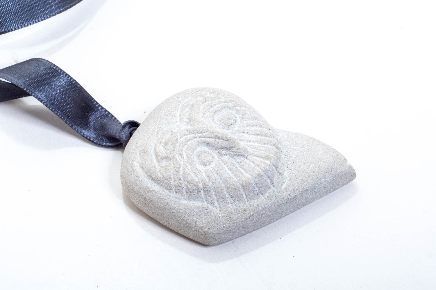 Handcarved stone pendant. Perfect as a statement jewelry piece, or to infuse with essential oils for aromatherapy. 2" approx height with ribbon.