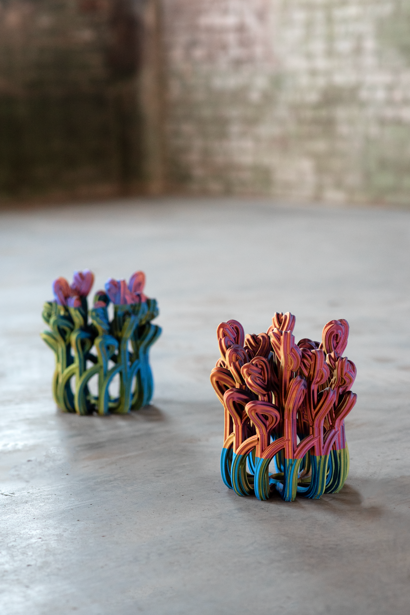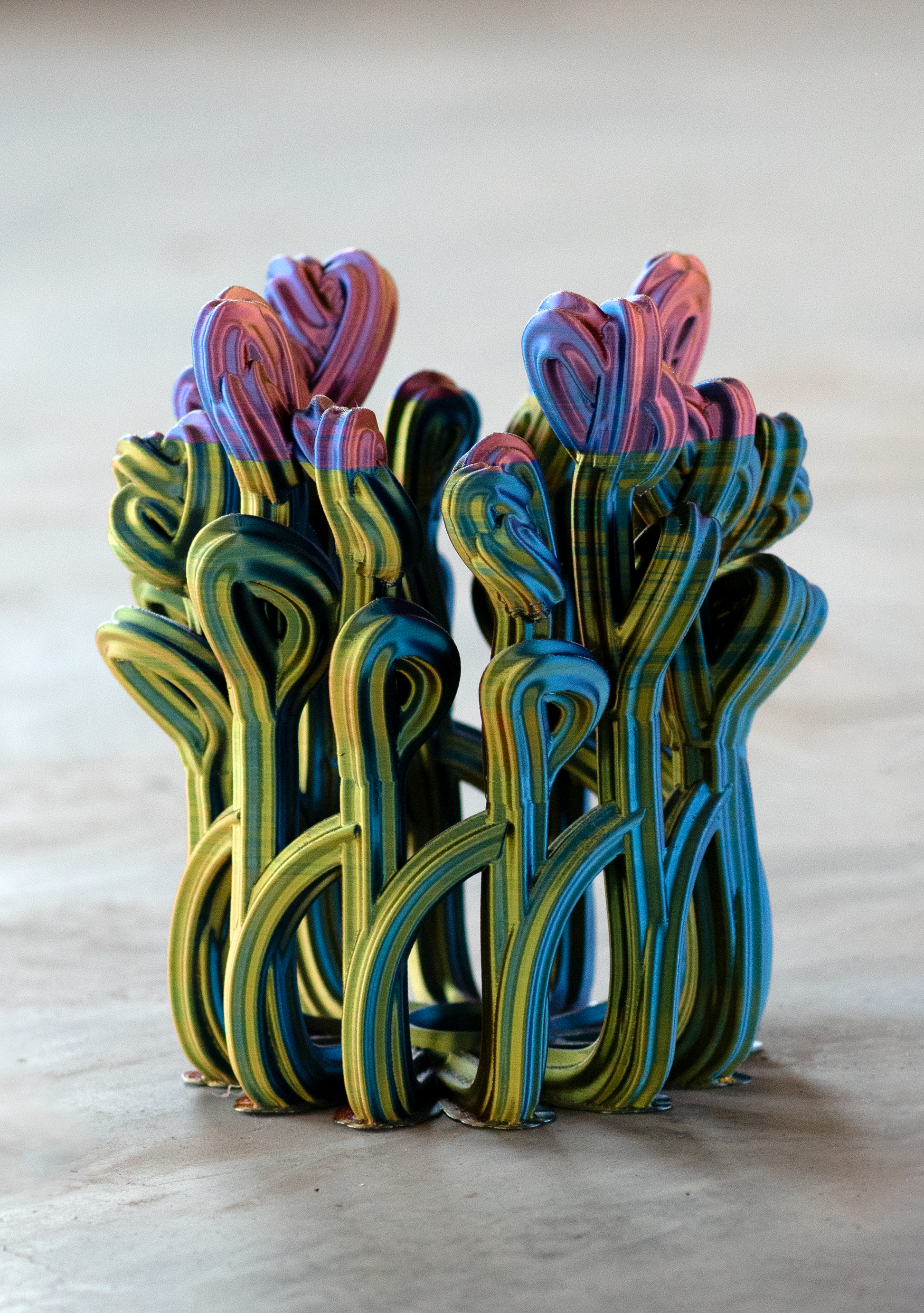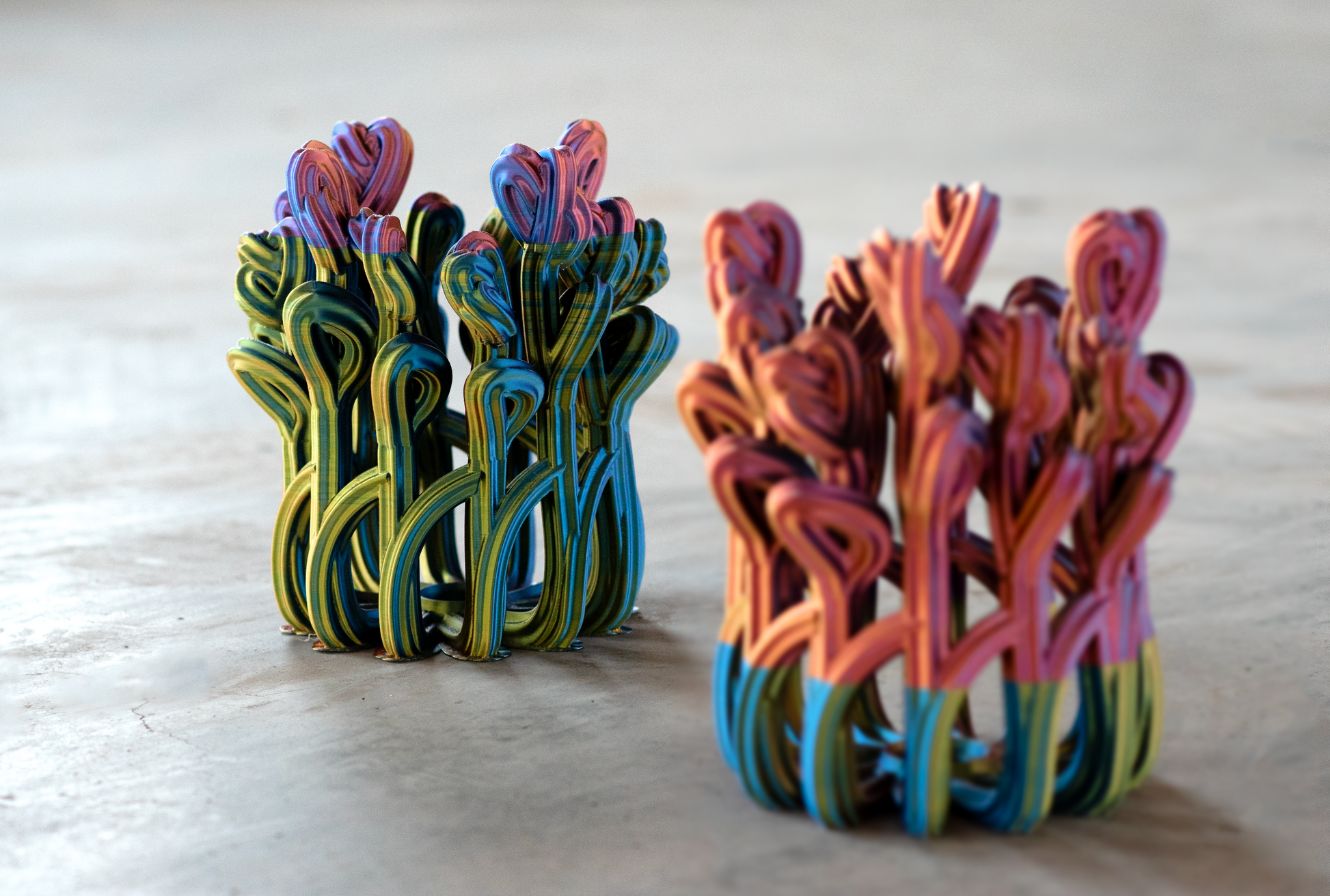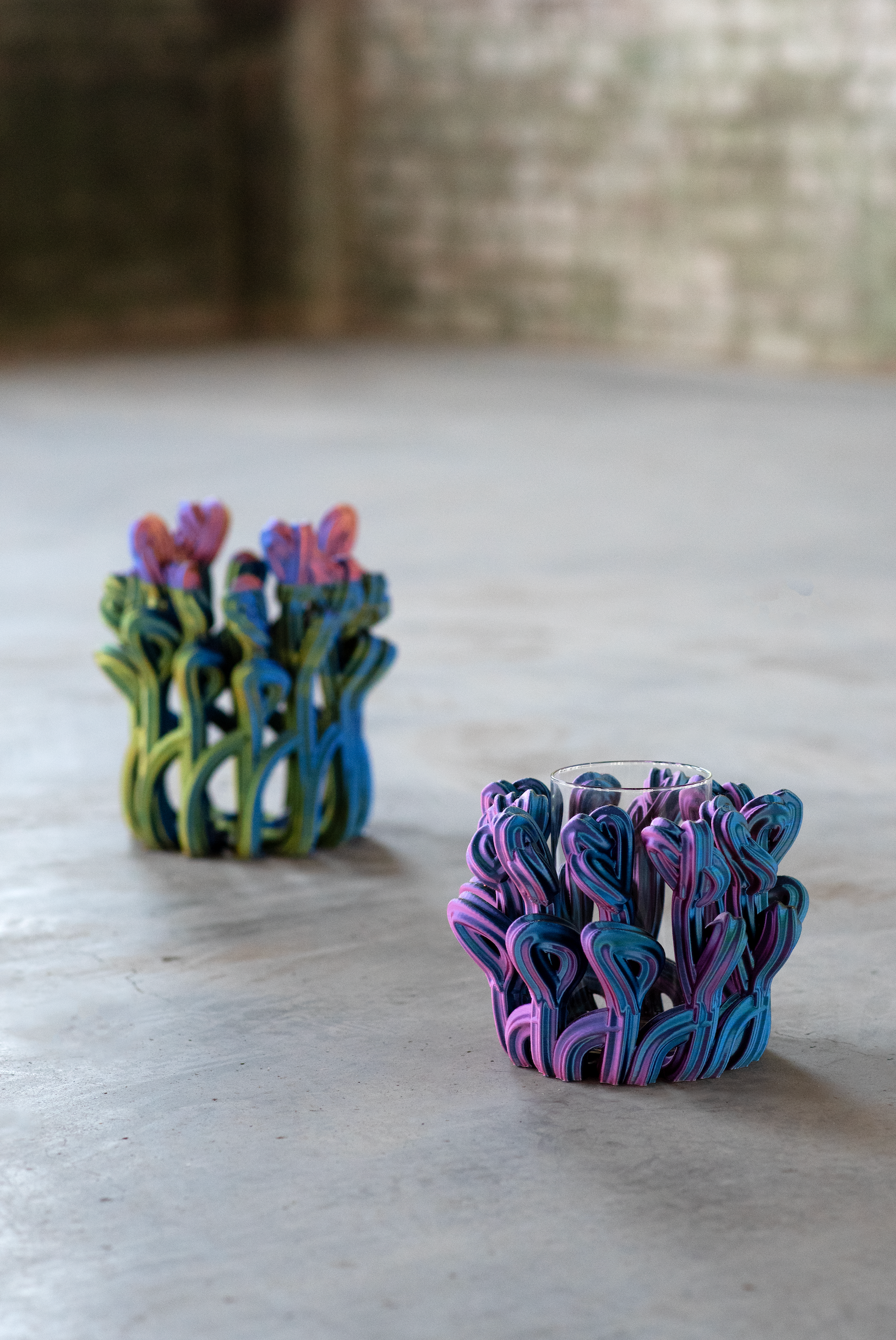 SuperBloom Collection captures the moment when nature bursts into life after a long pause. Each piece in the collection is created layer by layer, forming intricate loops that mimic the organic rhythm of blooming petals. Material: Glass + Pla