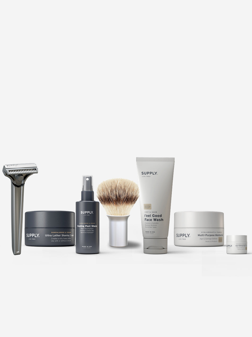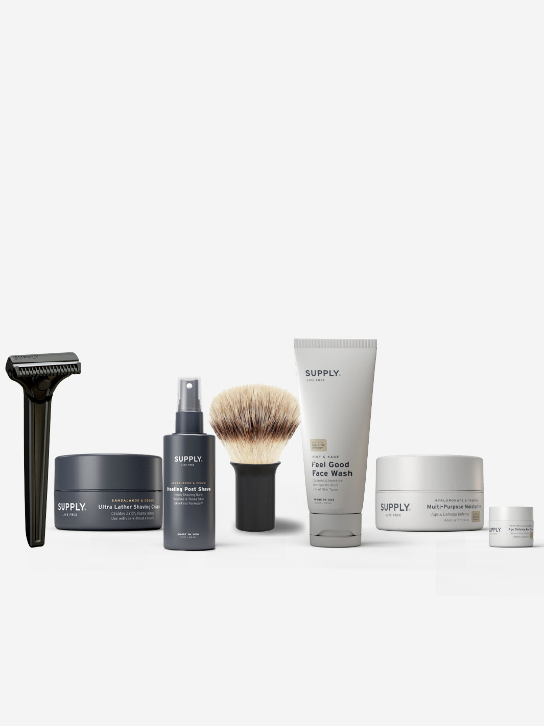 Lather up with the shaving cream and brush, then cool down afterwards with the soothing post shave. Use the face wash to freshen up, the moisturizer to stay hydrated, and the eye cream to repair your most tired and sun-damaged skin.