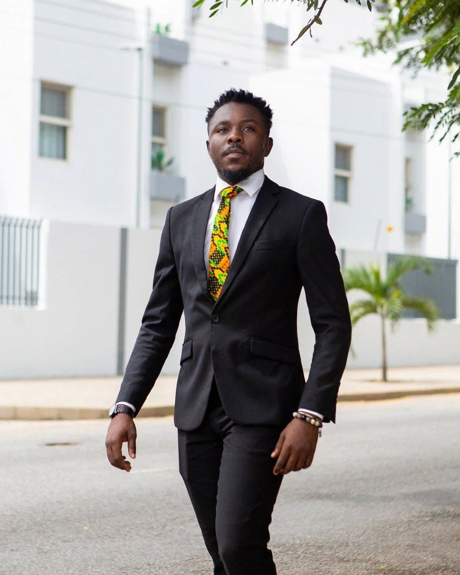 Stylish necktie, inspired by traditional African Kente designs. Handmade in Ghana, from locally produced fabric. 100% cotton.