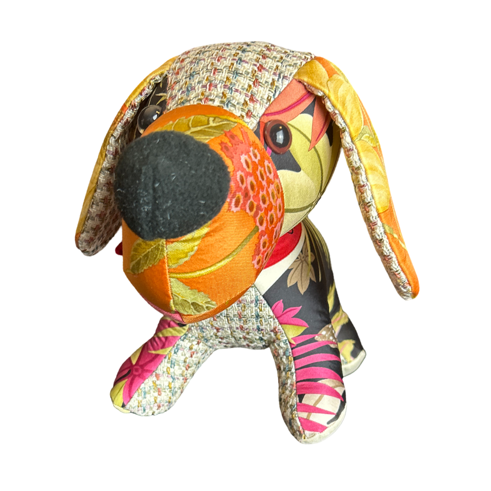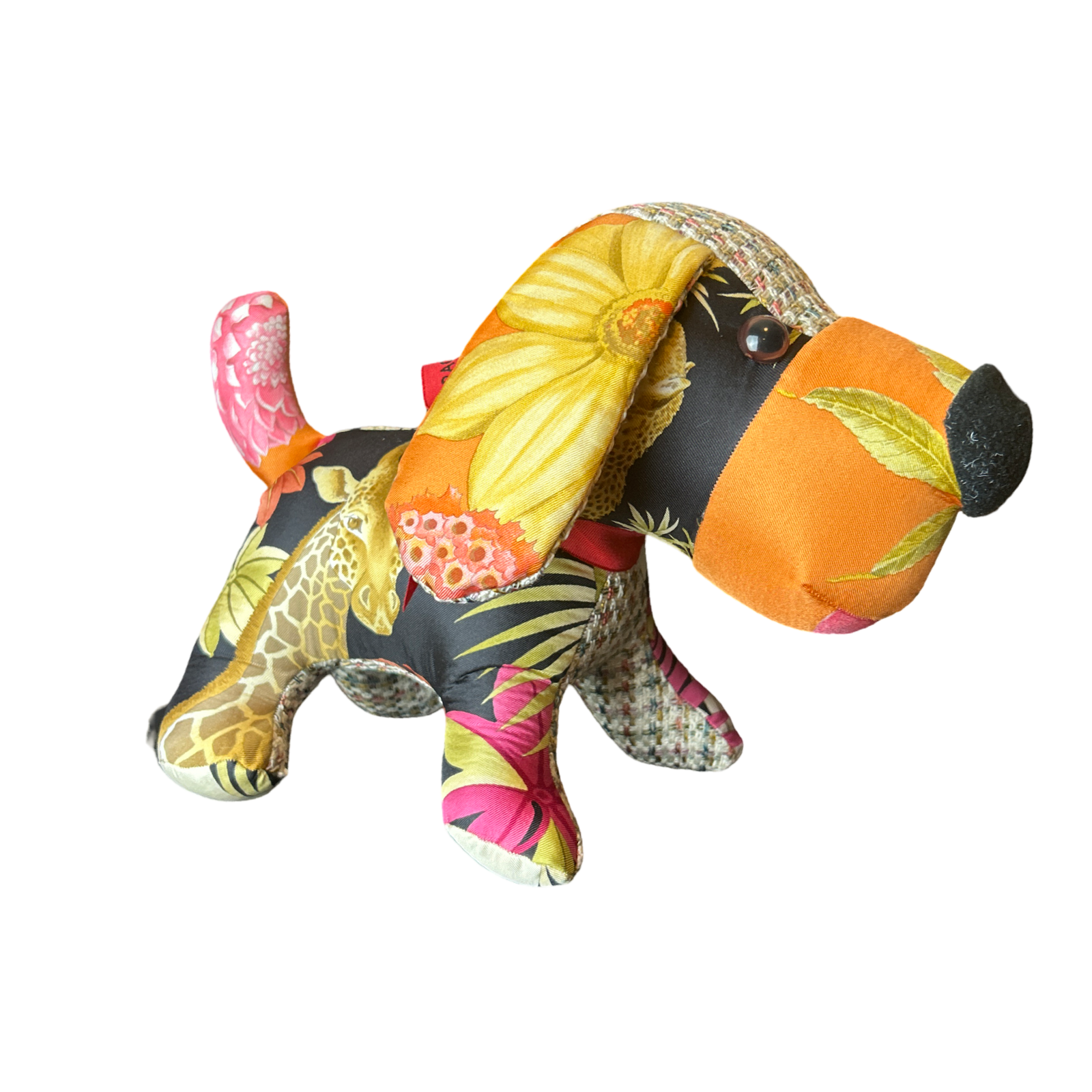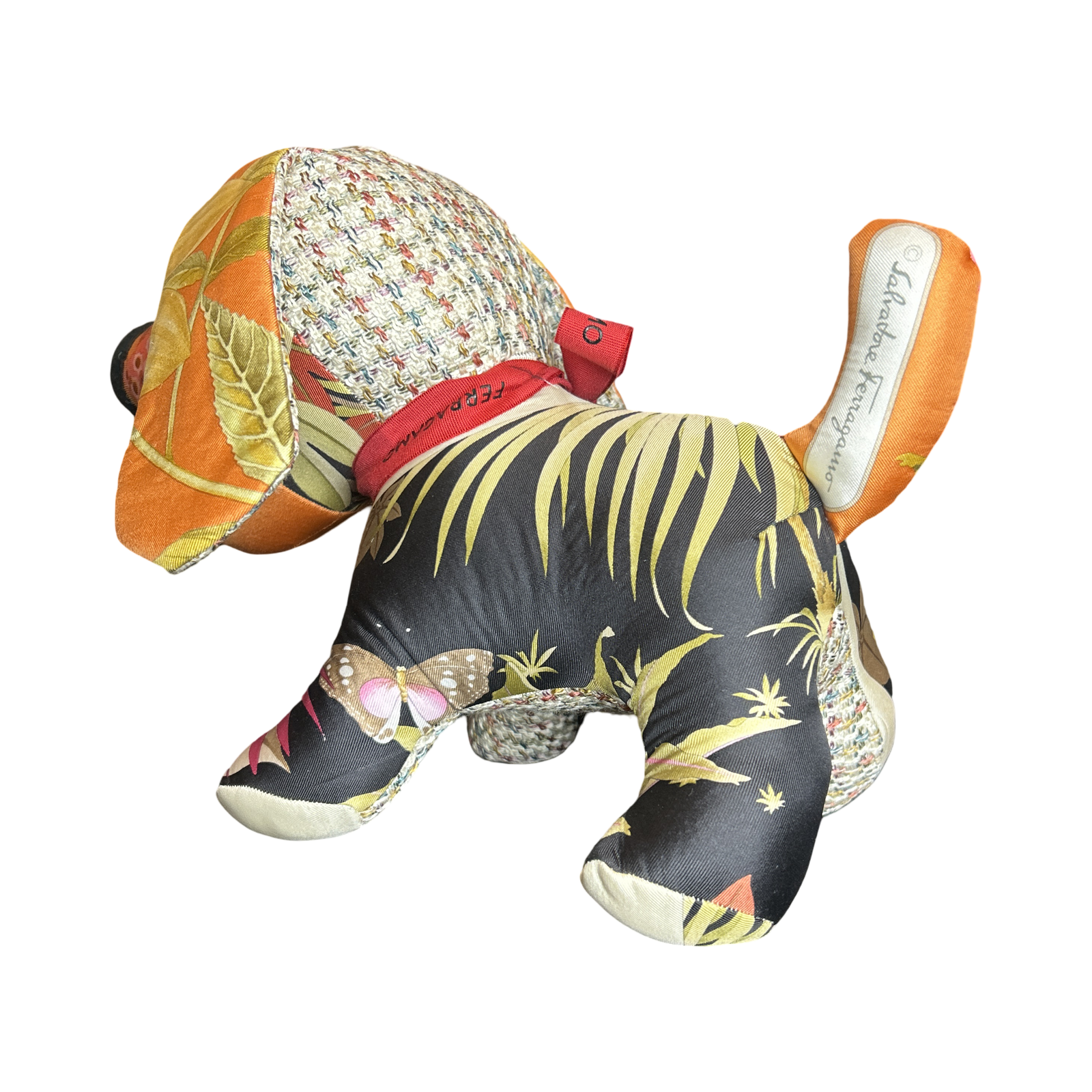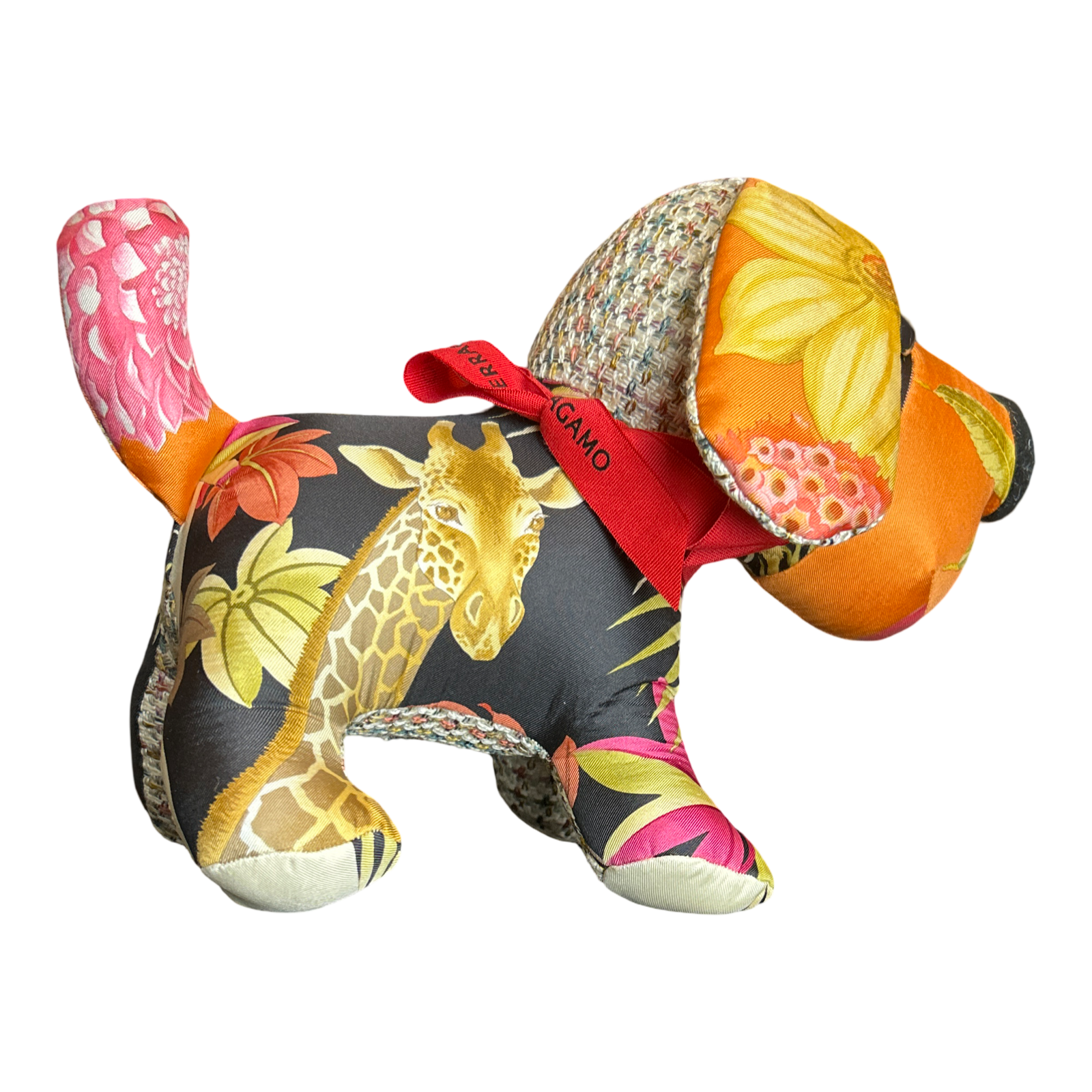 Vintage Ferragamo scarves paired with velvet cloth handmade into a one of a kind animal.  Non-Allergenic polyfill stuffing.  For decorative use only.