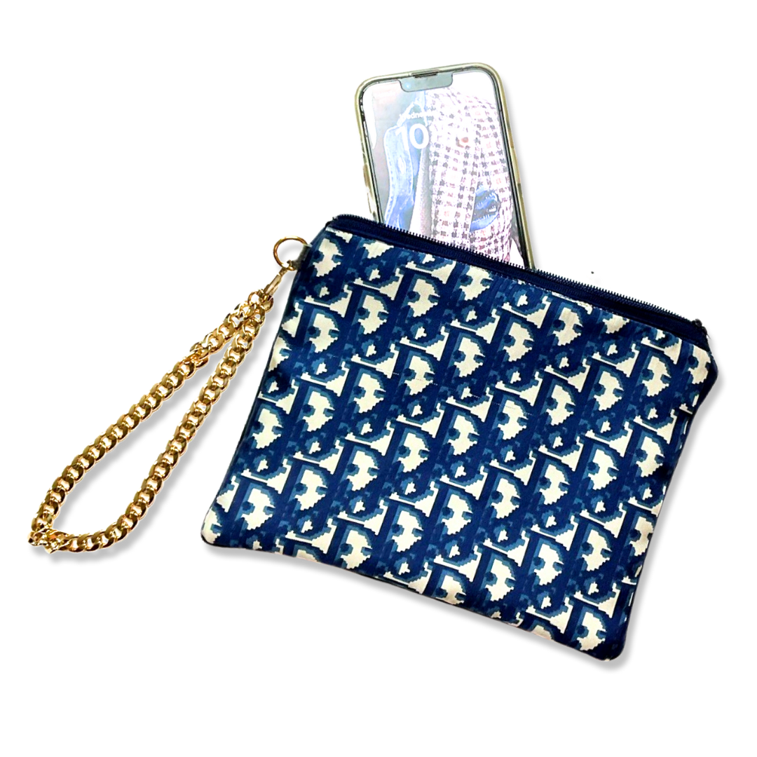 Vintage Dior Trotter scarf front paired with navy blue velvet reverse. Fully lined, zippered closure with removable 15” gold-tone wristlet chain.