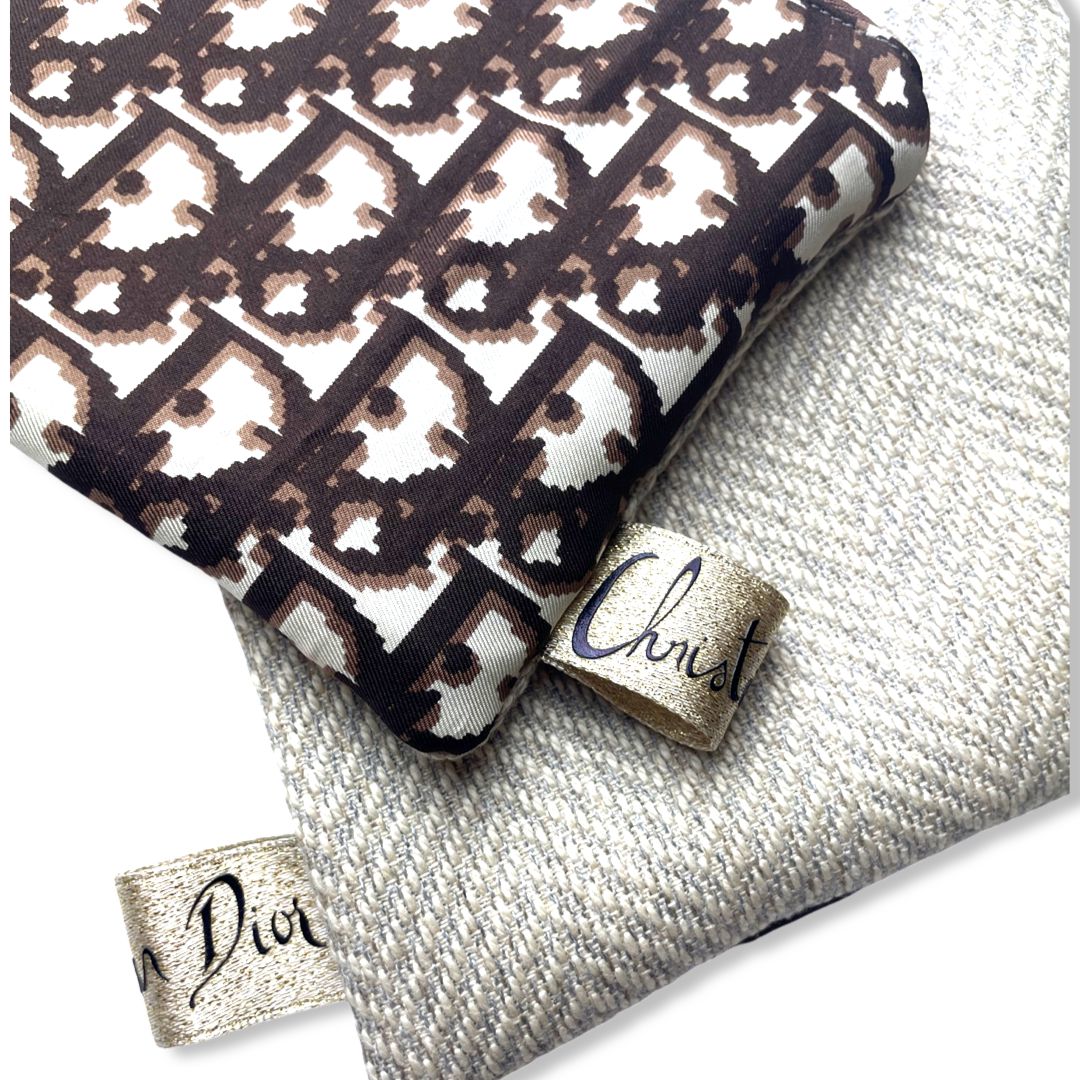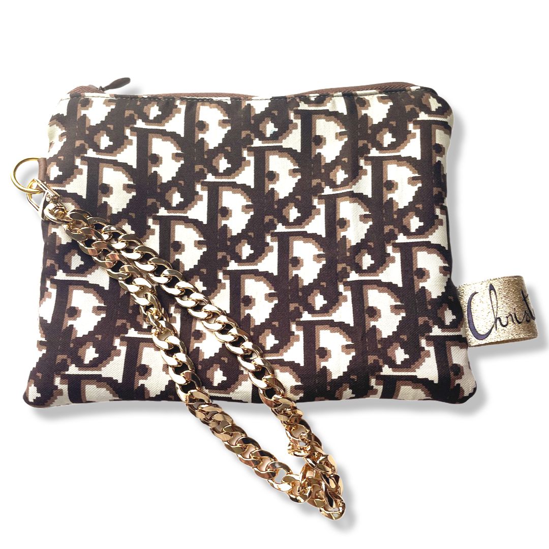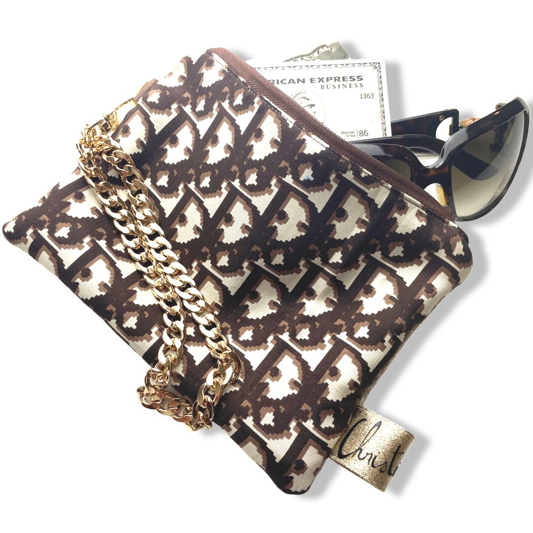 Vintage Dior Trotter scarf front paired with coordinating herringbone tweed reverse. Fully lined, zippered closure with removable 15” gold-tone wristlet chain.