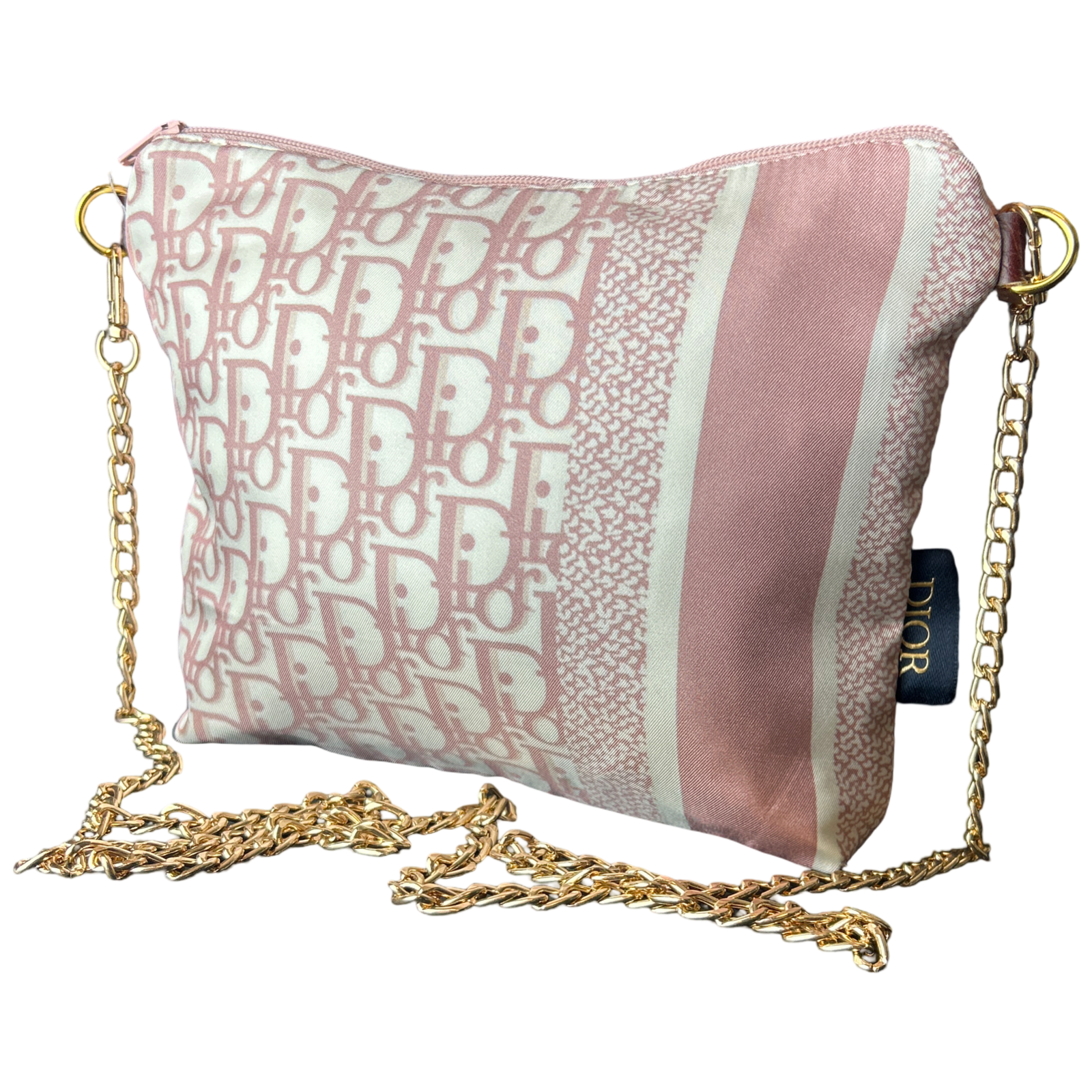 Limited editions, perfectly sized when you want to travel light, elegantly stashes all your essentials in a zippered bag with a gold-tone removable wrist chain.