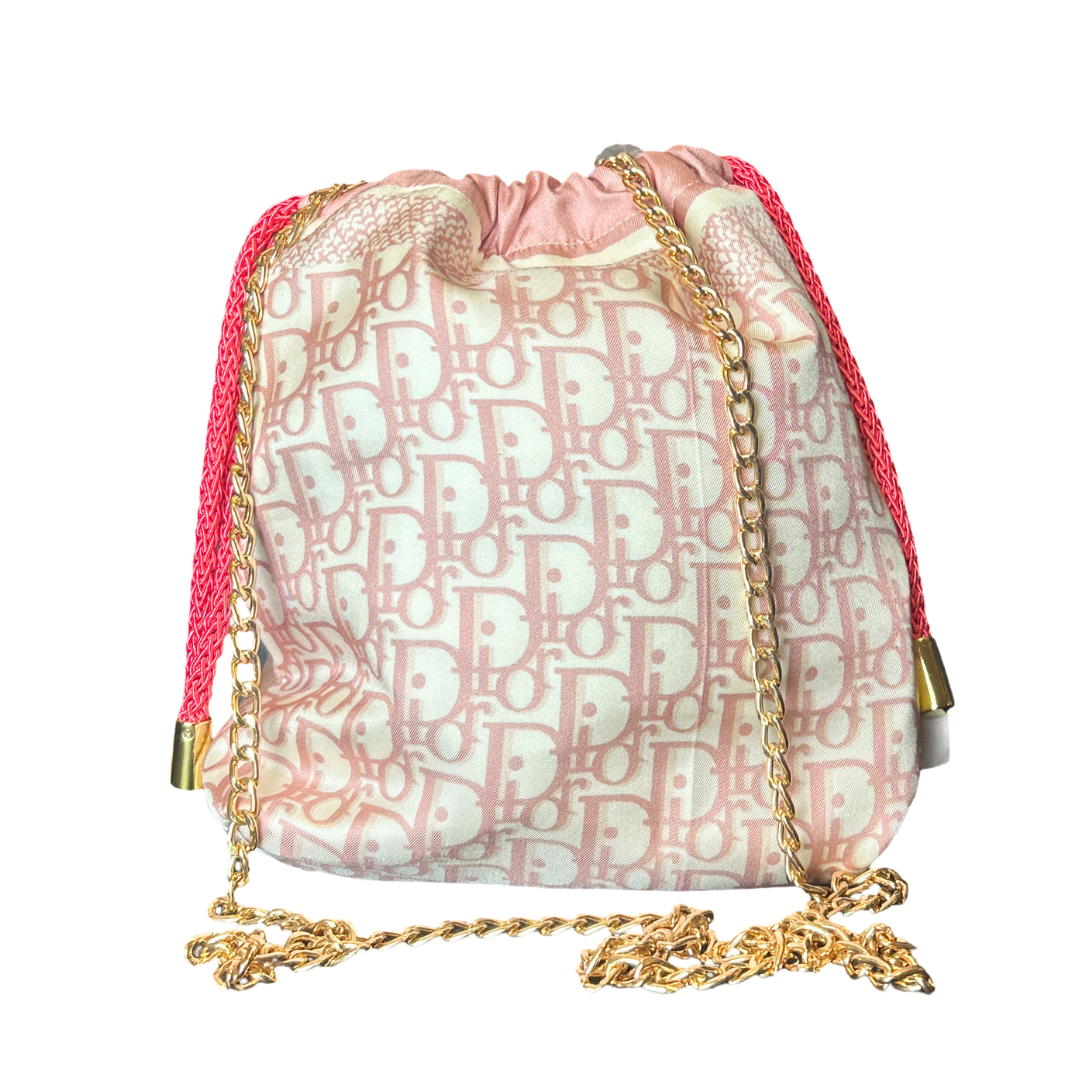 Reimagined from the world’s finest collection of vintage Dior scarves, our drawstring bag is the ultimate accessory for your on-the-go lifestyle.  Uniquely convertible from a crossbody to a handheld bag with both removable goldtone chain and silky drawstring cord.