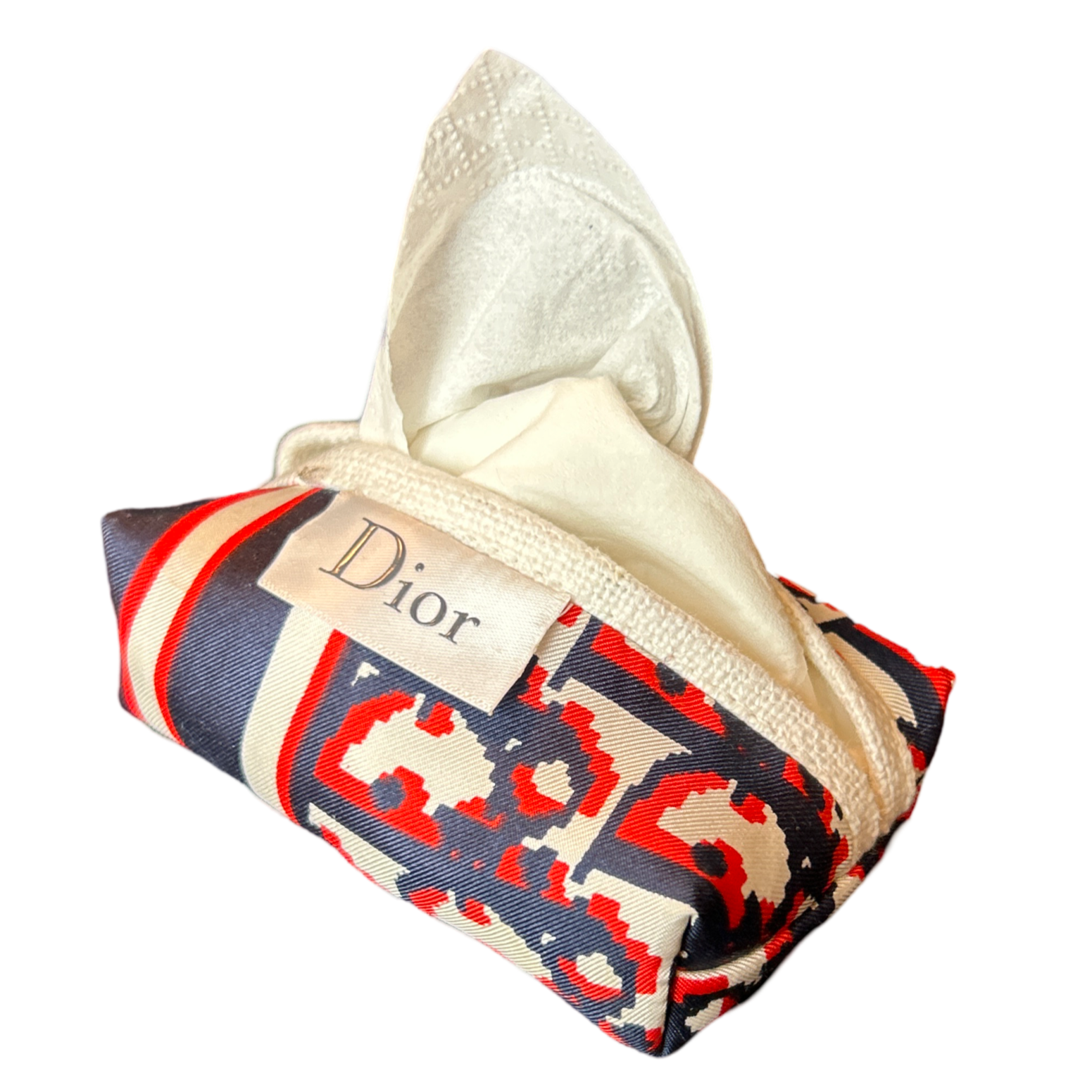 Vintage Dior silk scarf exterior paired with coordinating interior fabric. Includes 2 packets of tissues. Additional tissues available on Amazon or your local pharmacy.