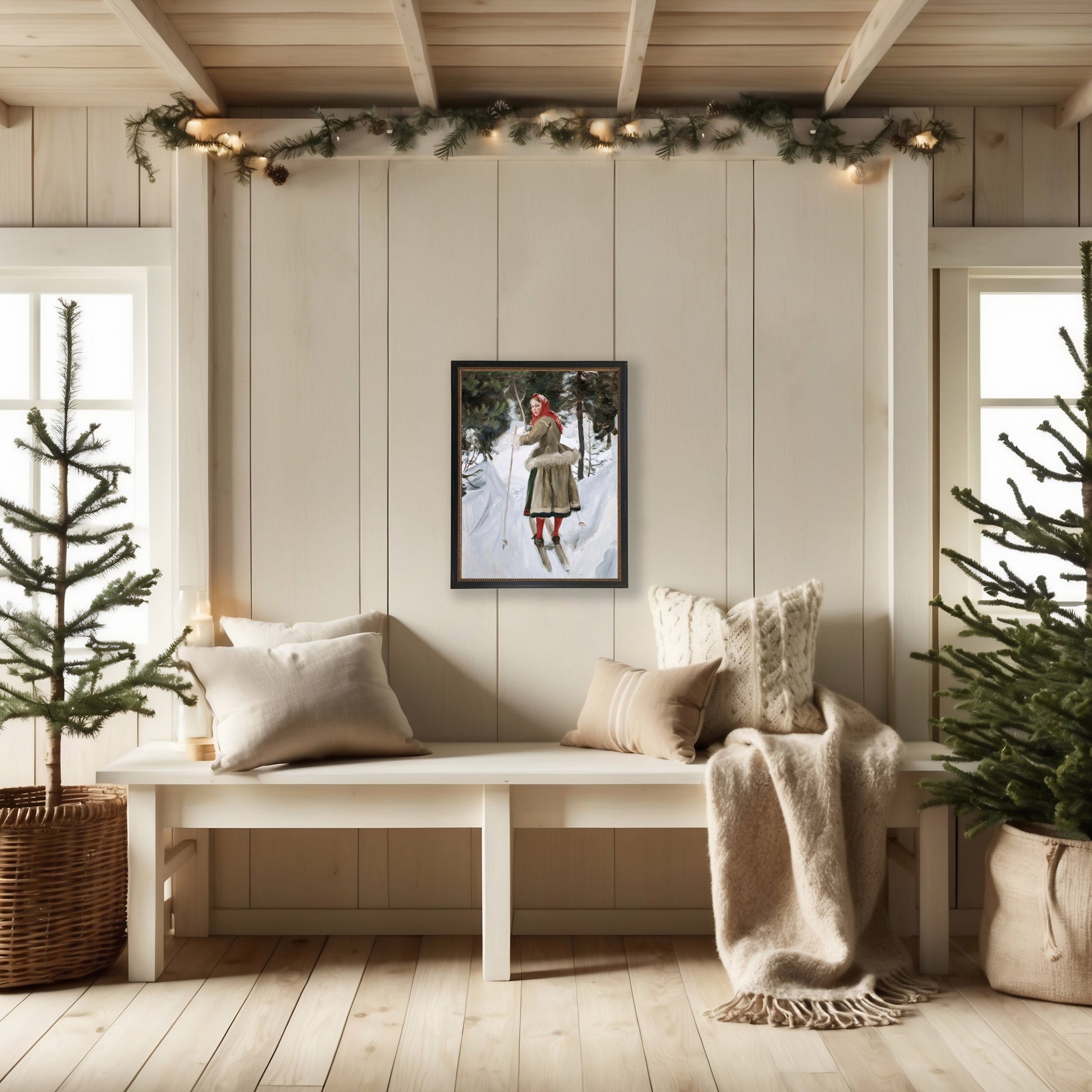 Vintage Oil Painting of Woman Skiing