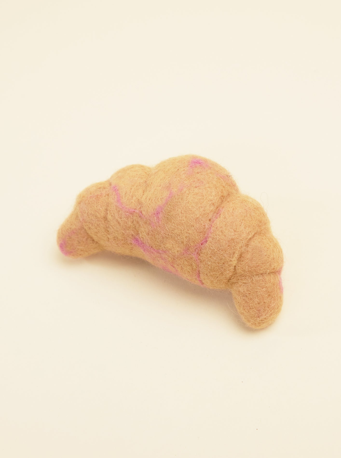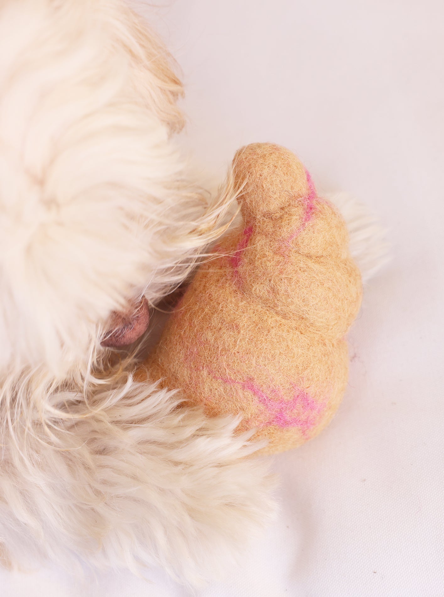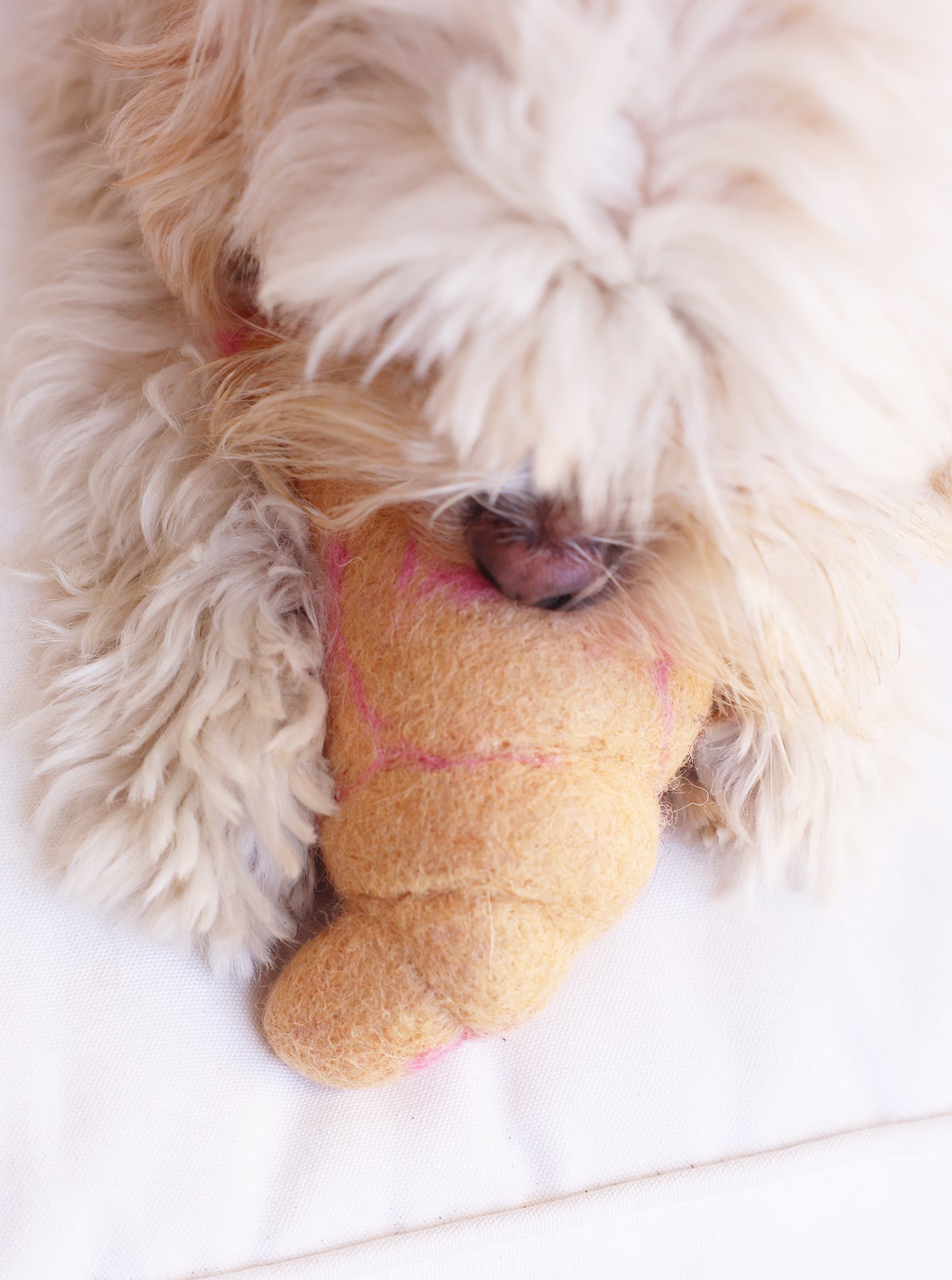 Our wool CROISSANT dog toy brings Parisian charm right to your dog’s paws. Handcrafted from 100% wool, it’s as soft as a real croissant, but a lot more durable. Perfect for gentle chewers and pups who dream of lounging at a sidewalk café (or maybe just the couch). DETAILS Size: 3.5" x 5” Material: 100% wool & lots of love! Sourced from New Zealand, our wool is known to be the whitest and cleanest wool in the world. All of our wool products are hand crafted, non-synthetic, eco-friendly and biodegradable making them completely safe for pets. Care: We made sure our toys are easy to clean because let's face it, our beasts can be messy! Spot clean with water. Lay flat to dry. Made in Nepal.